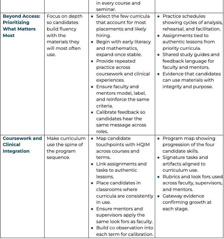Programs that make HQIM central to their design ensure that candidates rehearse with the same materials they will be expected to teach, receive feedback from faculty and clinical supervisors who share consistent expectations, and experience developmental growth that is measured and reinforced at every stage.